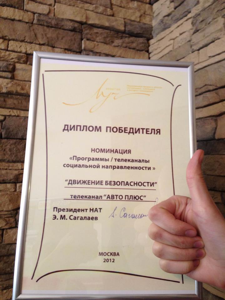 The “Road Safety” program live broadcast on the “Auto Plus” TV channel won one of the most prestigious “Golden Ray-2012” National Award in the “Socially oriented program/TV channel” nomination. The solemn award ceremony was organized by the National Association of Television and Radio Broadcasters of Russia (NAT) and Eutelsat Communications S.A. at the end of 2012.
